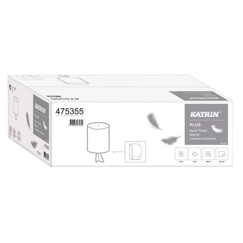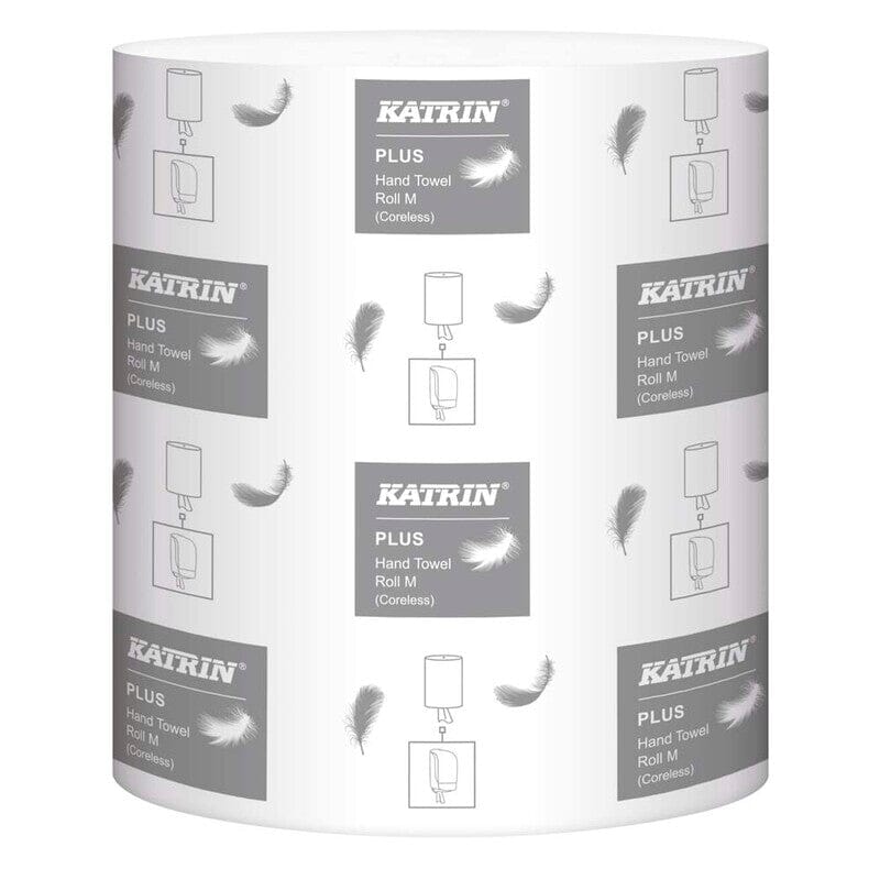 Katrin Plus M Coreless. Ekstra mykt og sterkt tørkepapir på rull av høyeste kvalitet for effektiv tørking. Rullen er uten kjerne, noe som forenkler påfylling av dispenseren. Egnet for middels til høy besøkshyppighet i mer eksklusive offentlige miljøer. 1-lags, hvit, Godkjent for direkte kontakt med næringsmidler, Svanemerket